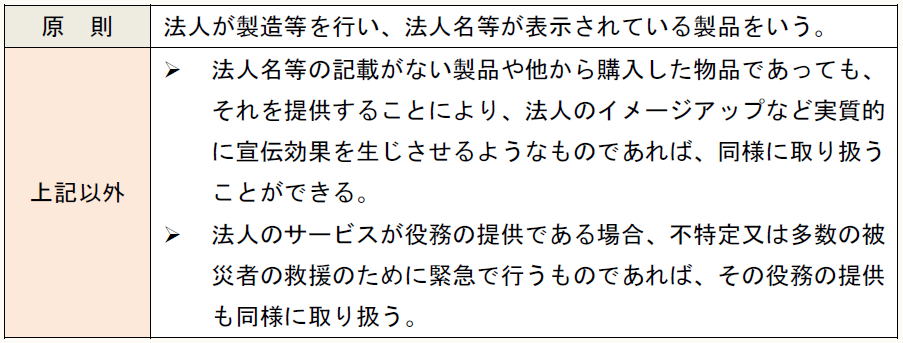 法人が不特定又は多数の被災者を救援するために、緊急に行う自社製品等の提供に要する費用は、寄附金や交際費等としては取り扱わず、全額を損金に算入する(法基通9-4-6の4、措通61の4(1)-10の4)。