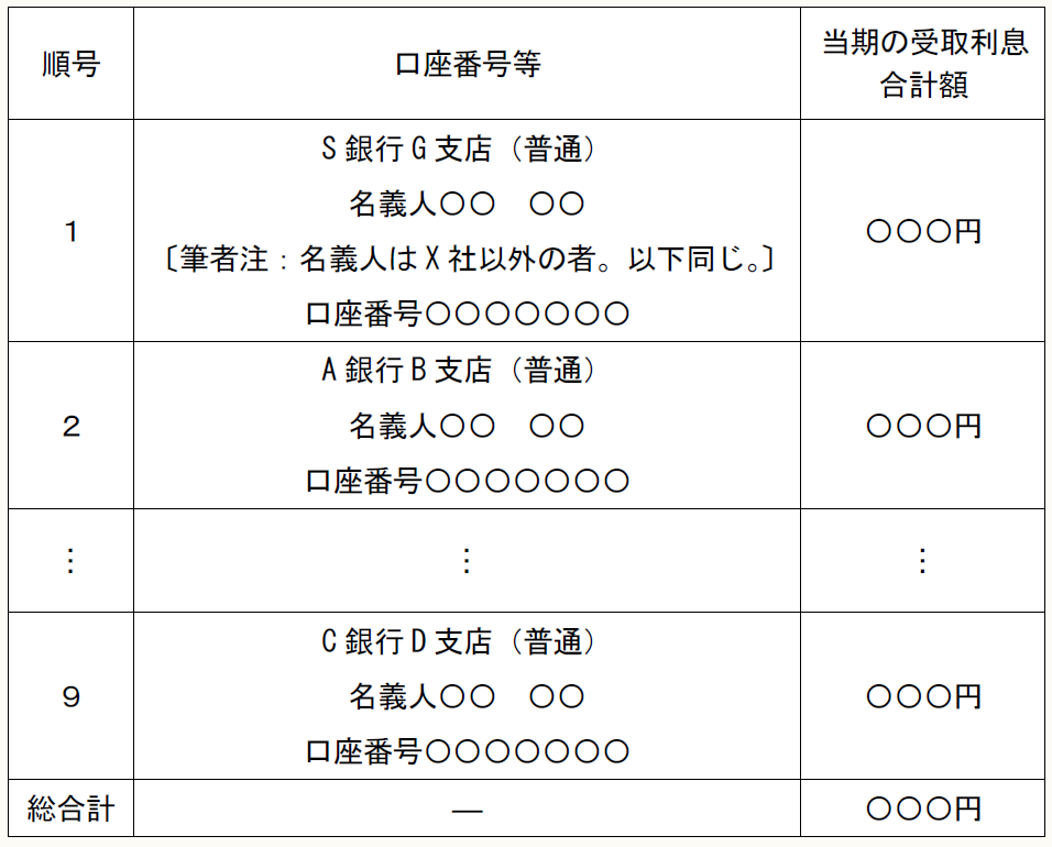 次表のとおり、S銀行G支店ほか8口の定期預金の受取利息を当期の益金の額に算入します。