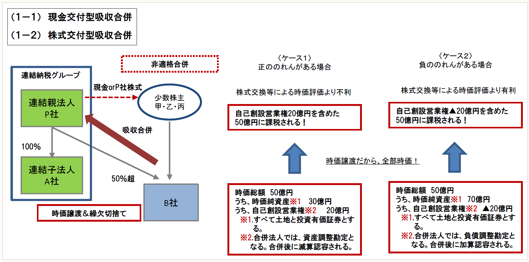 したがって、合併又は株式交換等がいずれも非適格となる場合、正ののれんがある場合は、完全子法人化の合併スキーム(1-3、1-4、1-5)が有利となる。負ののれんがある場合は、直接合併のスキーム(1-1、1-2)が有利となる。