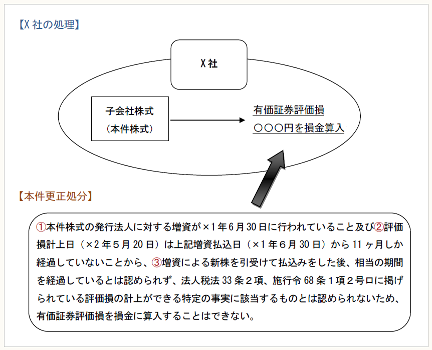 貴法人は、貴法人の有する米国に所在する子会社の株式(以下「本件株式」といいます。)に係る評価損の額〇〇〇円を当事業年度の損金の額に算入しています。しかしながら、本件株式の発行法人に対する増資が×1年6月30日に行われていること及び評価損計上日(×2年5月20日)は増資払込日(×1年6月30日)から11か月しか経過していないことから、増資による新株を引受けて払込みをした後、相当の期間を経過しているとは認められず、法人税法33条2項、施行令68条1項2号ロに掲げられている評価損の計上ができる特定の事実に該当するものとは認められません。