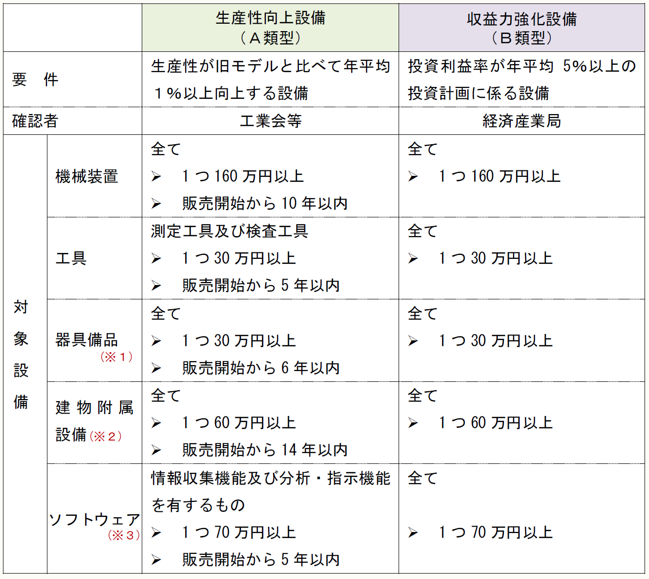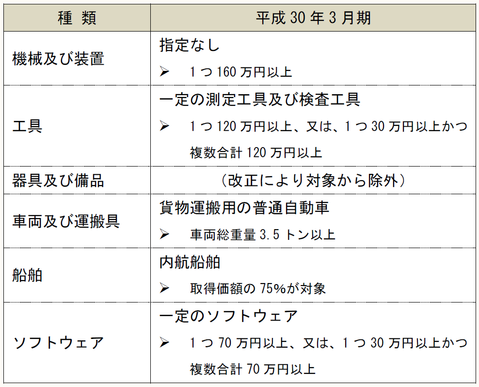 平成29年3月31日までに取得等をして事業供用した資産が対象であったが、平成29年度税制改正により、その期限が平成31年3月31日まで2年間延長された。ただし、改正後は適用対象資産から「器具及び備品」が除かれている。
