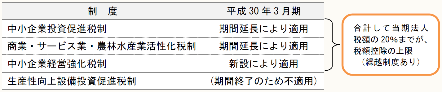 平成29年3月31日までに取得等をして指定事業に供用した資産が対象であったが、平成29年度税制改正により、その期限が平成31年3月31日まで2年間延長されている。したがって、平成30年3月期の決算申告においては適用が継続される。
