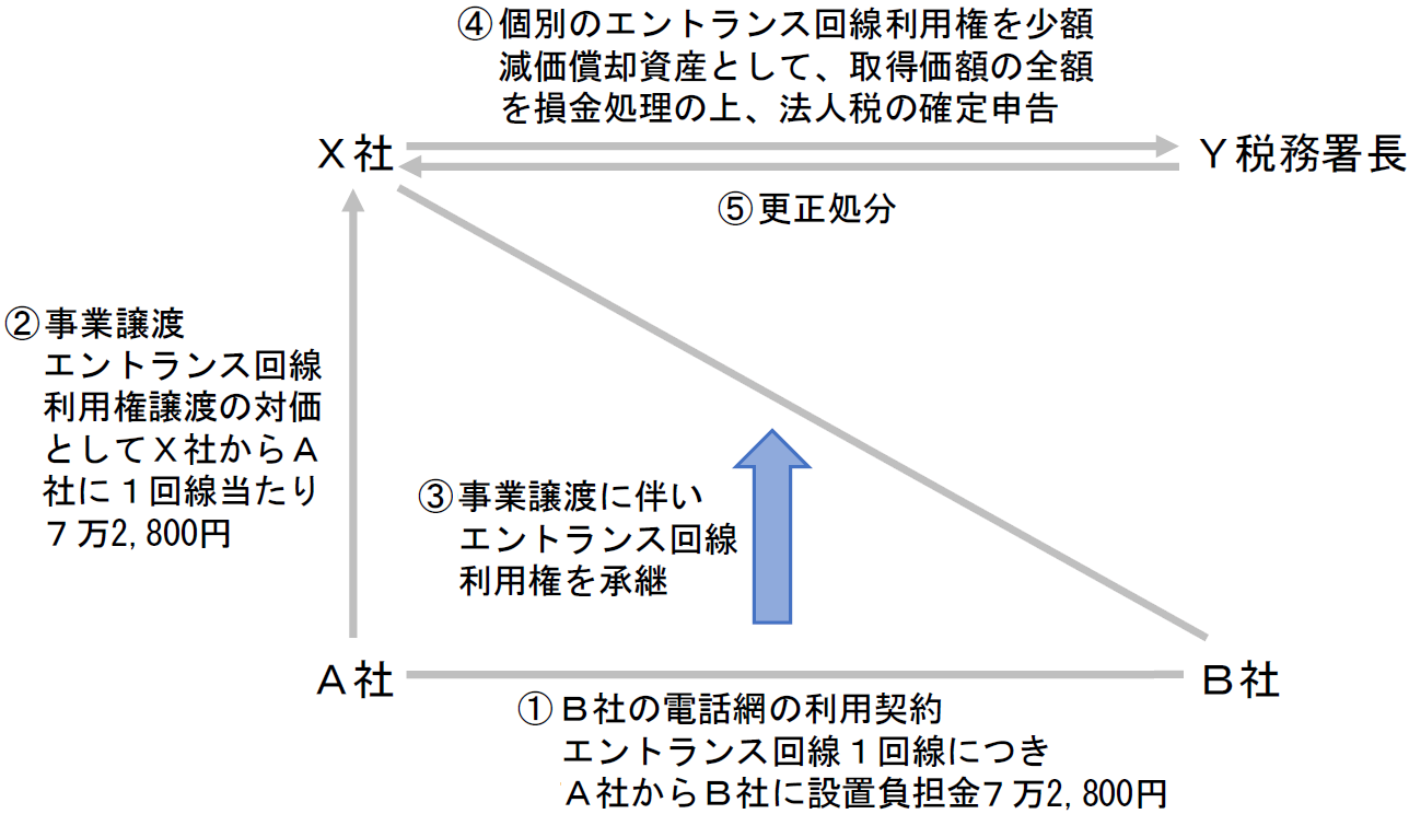 X社は、A社からその事業の譲渡を受けることとし、A社に対し、エントランス回線利用権譲渡の対価として、1回線当たり7万2,800円を支払った。