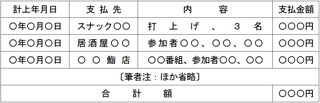 「支払金額」欄には、1件1万円以上、参加者1人当たりにしても、3千円から5、6千円程度又はそれ以上に達する金額の記載がある。〕