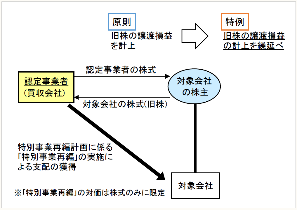 買収会社が事業再編の計画について主務大臣の認定を受けることにより、買収に応じた対象会社株主は、課税の繰延べが可能となり、納税資金の確保が不要となる。また、買収会社は株価下落リスクの懸念もなくなる。