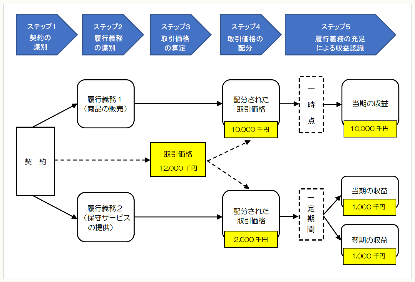 ステップ4:商品及び保守サービスの独立販売価格に基づき、取引価格12,000 千円を各履行義務に配分する。商品の取引価格は10,000千円、保守サービスの取引価格は2,000千円とする。