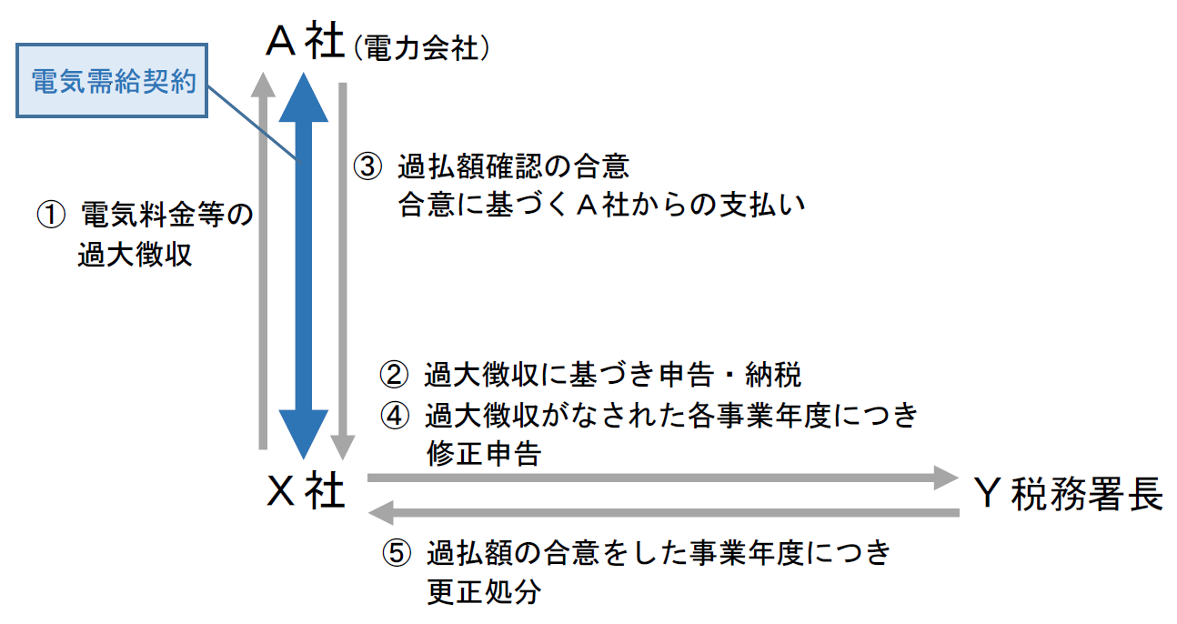 X社は、電力会社A社との間で電力需給契約を締結し、A社から電気の供給を受けていた。ところが、計量装置の設定誤りにより、12年にわたって、A社がX社から過大に電気料金を徴収していたことが判明した。その間、X社は、誤った電気料金をもとに電気税を納付し、また、支払った電気料金等を損金に算入して法人税の申告と納付を行ってきた。