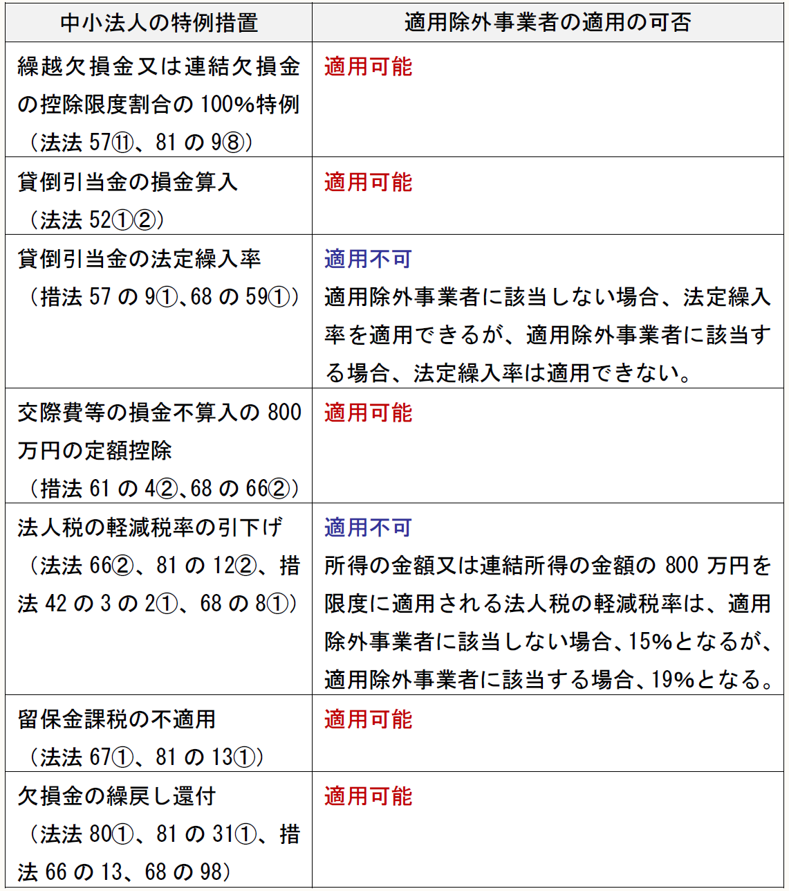 中小法人の特例措置のうち、適用除外事業者の適用関係は次のとおりとなる。