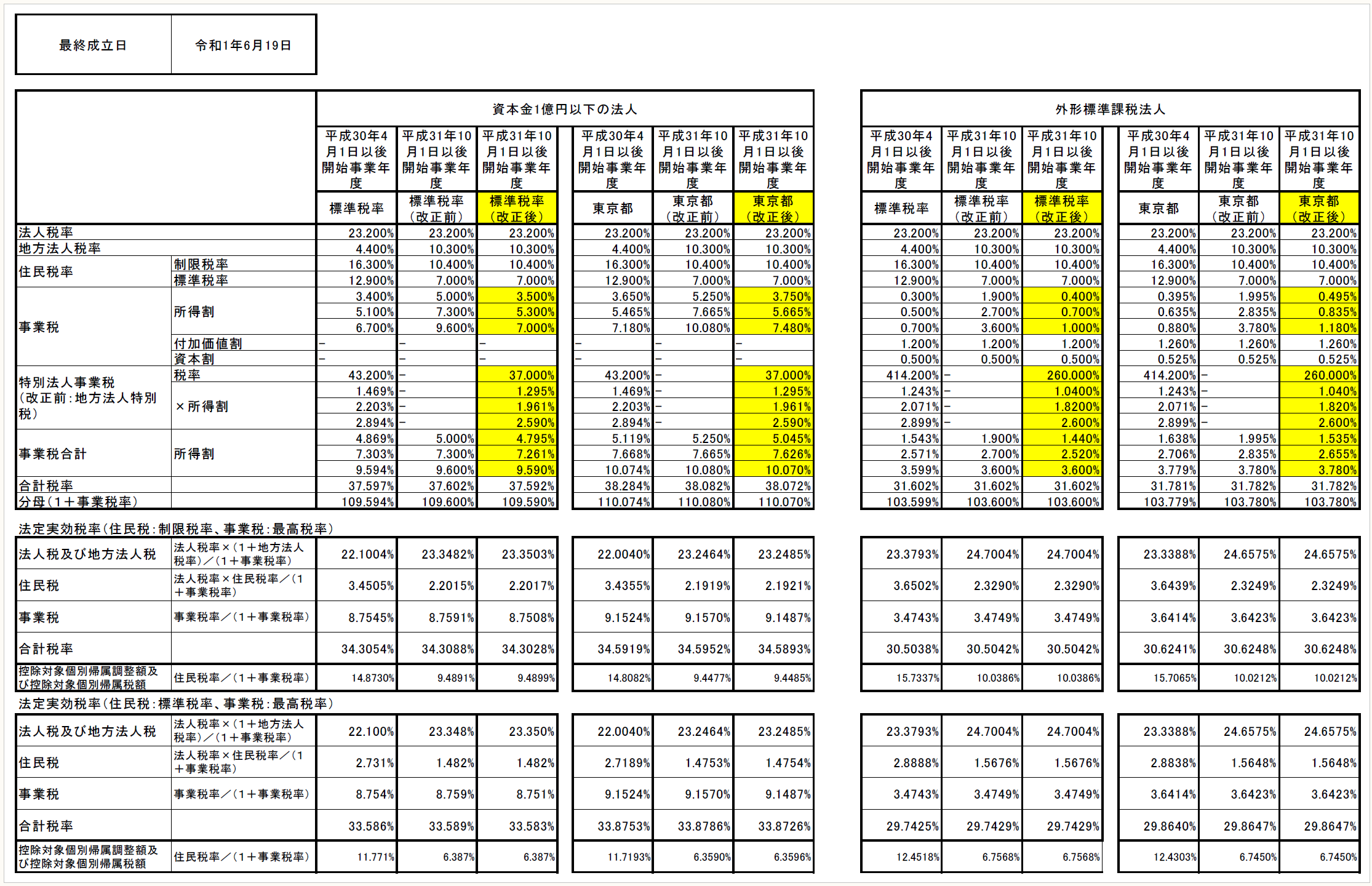 改正前後の法定税率と法定実効税率について、以下に【税率の一覧表】を示しておく。