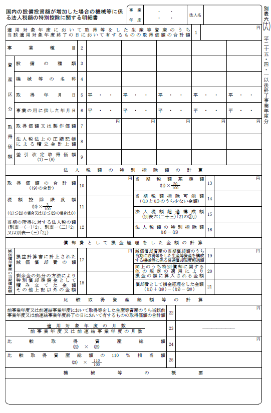 特別控除については、「国内の設備投資額が増加した場合の機械等に係る法人税額の特別控除に関する明細書」として、下記「別表6(18)」が公表されている。