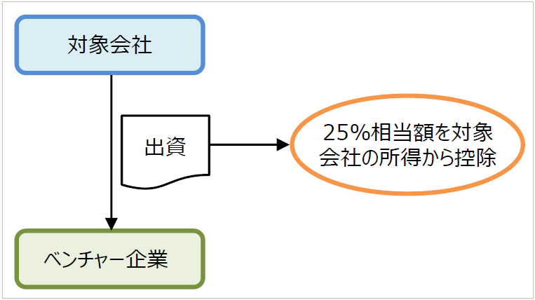 青色申告書を提出する法人が、一定のベンチャー企業に対して出資を行う場合に、その投資額の25%相当額の所得控除を認める制度である。ただし、株式取得の日から5年以内に当該株式を売却等した場合は、その部分を益金に参入することになるので注意が必要である。