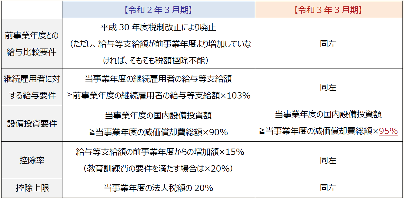 【令和2年3月期】 【令和3年3月期】 前事業年度との給与比較要件 平成30年度税制改正により廃止 (ただし、給与等支給額が前事業年度より増加していなければ、そもそも税額控除不能) 同左 継続雇用者に 対する給与要件 当事業年度の継続雇用者の給与等支給額 ≧前事業年度の継続雇用者の給与等支給額×103% 同左 設備投資要件 当事業年度の国内設備投資額 ≧当事業年度の減価償却費総額×90% 当事業年度の国内設備投資額 ≧当事業年度の減価償却費総額×95% 控除率 給与等支給額の前事業年度からの増加額×15% (教育訓練費の要件を満たす場合は×20%) 同左 控除上限 当事業年度の法人税額の20% 同左