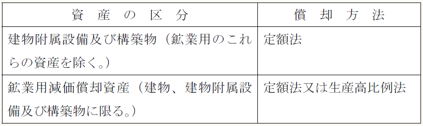 既報のとおり平成28年度税制改正では減価償却方法の見直しが行われ、平成28年4月1日取得分から、下表の通り建物附属設備及び構築物については定率法が廃止され定額法一本とされた。また鉱業用減価償却資産についても定率法が廃止され定額法又は生産高比例法のみとされている。