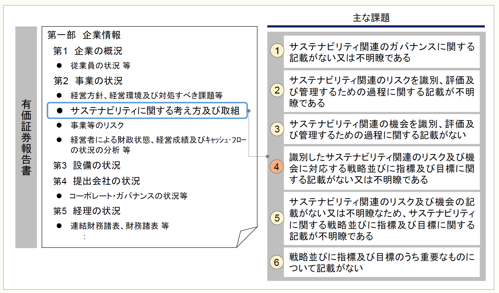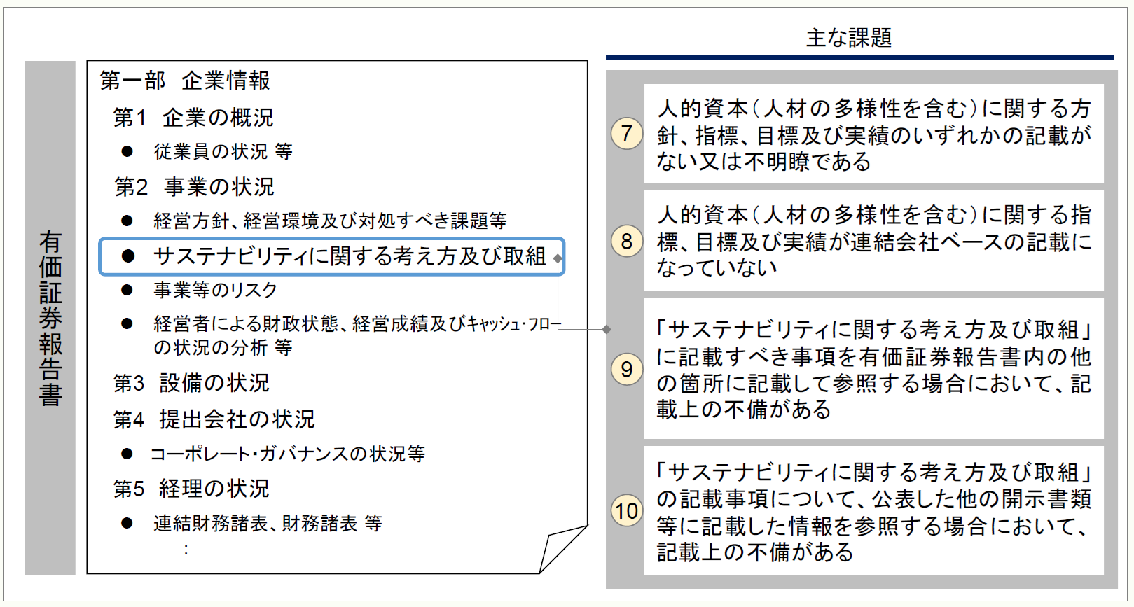 有価証券報告書におけるサステナビリティの記載について、現状、記載の充実に差があると考えられる。サステナビリティの記載は、各社の対応により毎期記載内容が変わる、また、具体的に記載することが有用な情報の提供につながるため、前期と同様の記載で良いのか十分に検討することが重要であると考えられる。金融庁の審査結果でも課題が取り上げられているため、各社参考にしてもらいたい。
