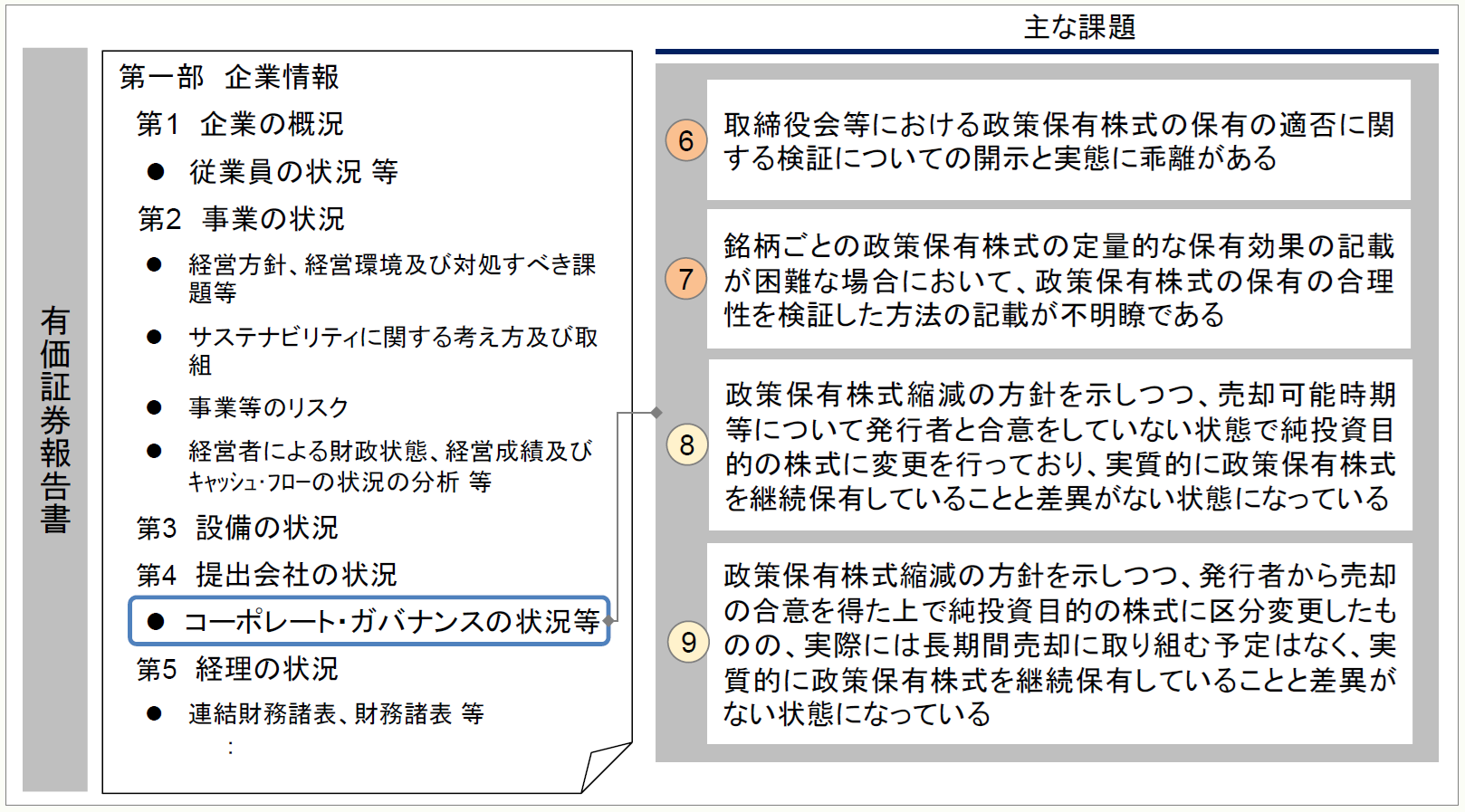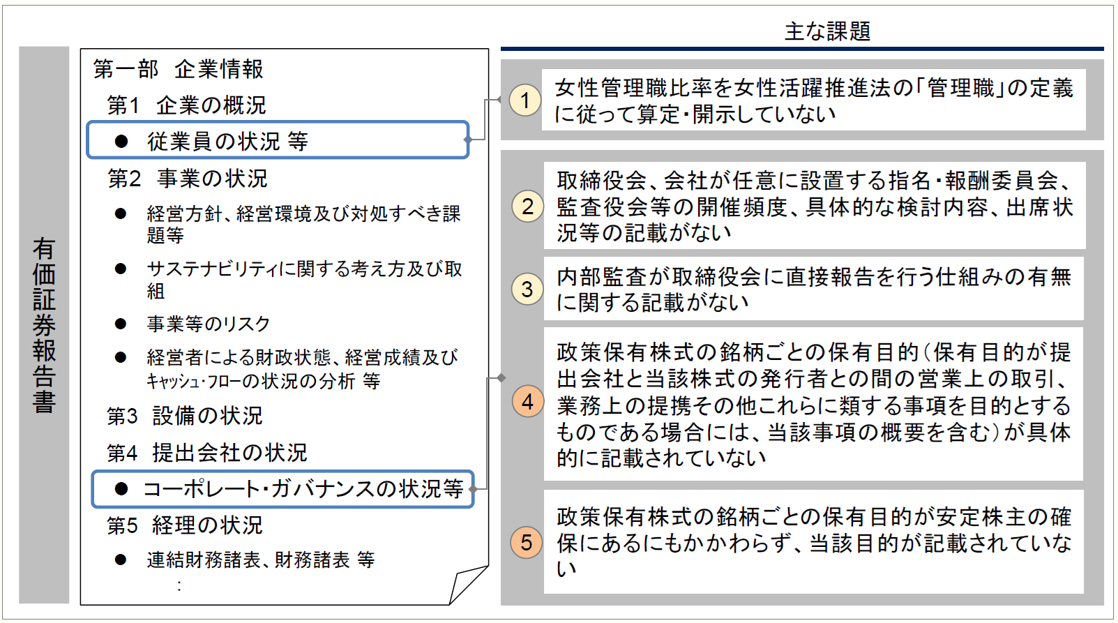 有価証券報告書における従業員の状況における女性管理職比率、コーポレート・ガバナンス、政策保有株式の記載誤りがあるため、金融庁の審査結果で課題が取り上げられている。