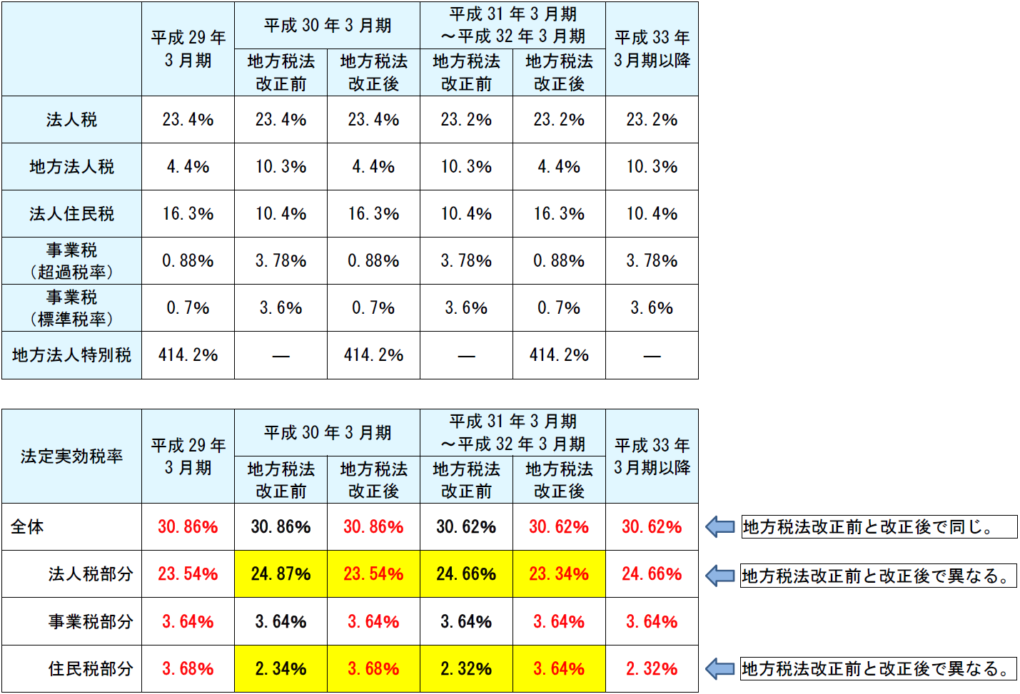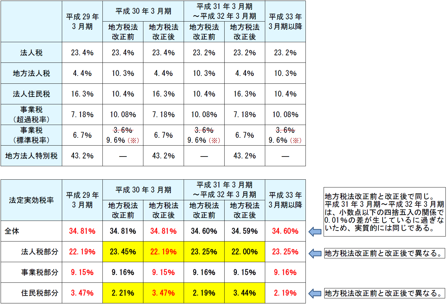 さらに、平成29年4月1日以後に開始する事業年度より法人住民税(道府県民税、市町村民税)の法人税割の税率が都道府県民税で3.2%から1.0%へ、市町村民税は9.7%から6.0%へ引き下げられた。