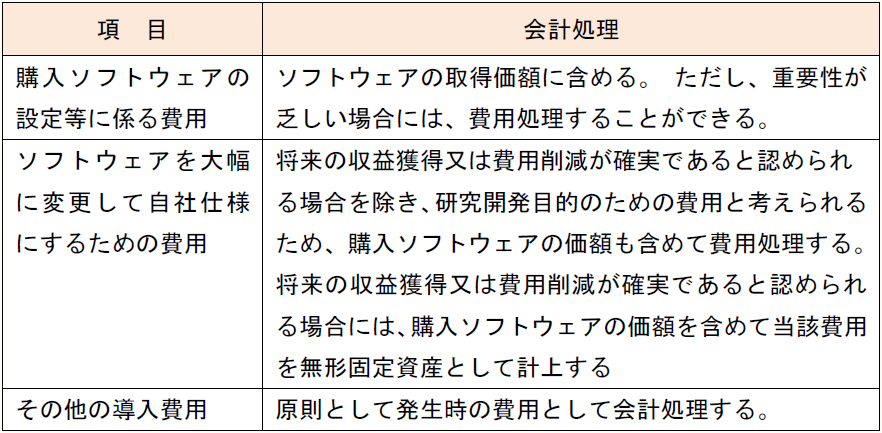 外部から購入したソフトウェアについて、そのソフトウェアの導入に当たって必要とされる設定作業及び自社の仕様に合わせるために行う付随的な修正作業等の費用は、購入ソフトウェアを取得費用として当該ソフトウェアの取得価額に含める。ただし、これらの費用について重要性が乏しい場合には、費用処理することができる(指針14)。