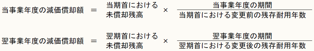 例えば、利用可能期間の見直しの結果、新たに入手可能となった情報に基づいて当事業年度末において耐用年数を変更した場合には、以下の計算式により当事業年度及び翌事業年度の減価償却額を算定する(指針21)。