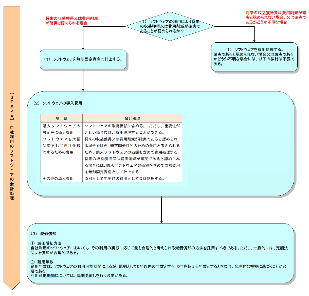 ソフトウェアの利用により将来の収益獲得又は費用削減が確実であることが認められるという要件が満たされているか否かを判断する。その結果、将来の収益獲得又は費用削減が確実と認められる場合はソフトウェアを無形固定資産に計上し、確実であると認められない場合又は確実であるかどうか不明な場合には、費用処理する(指針11)。