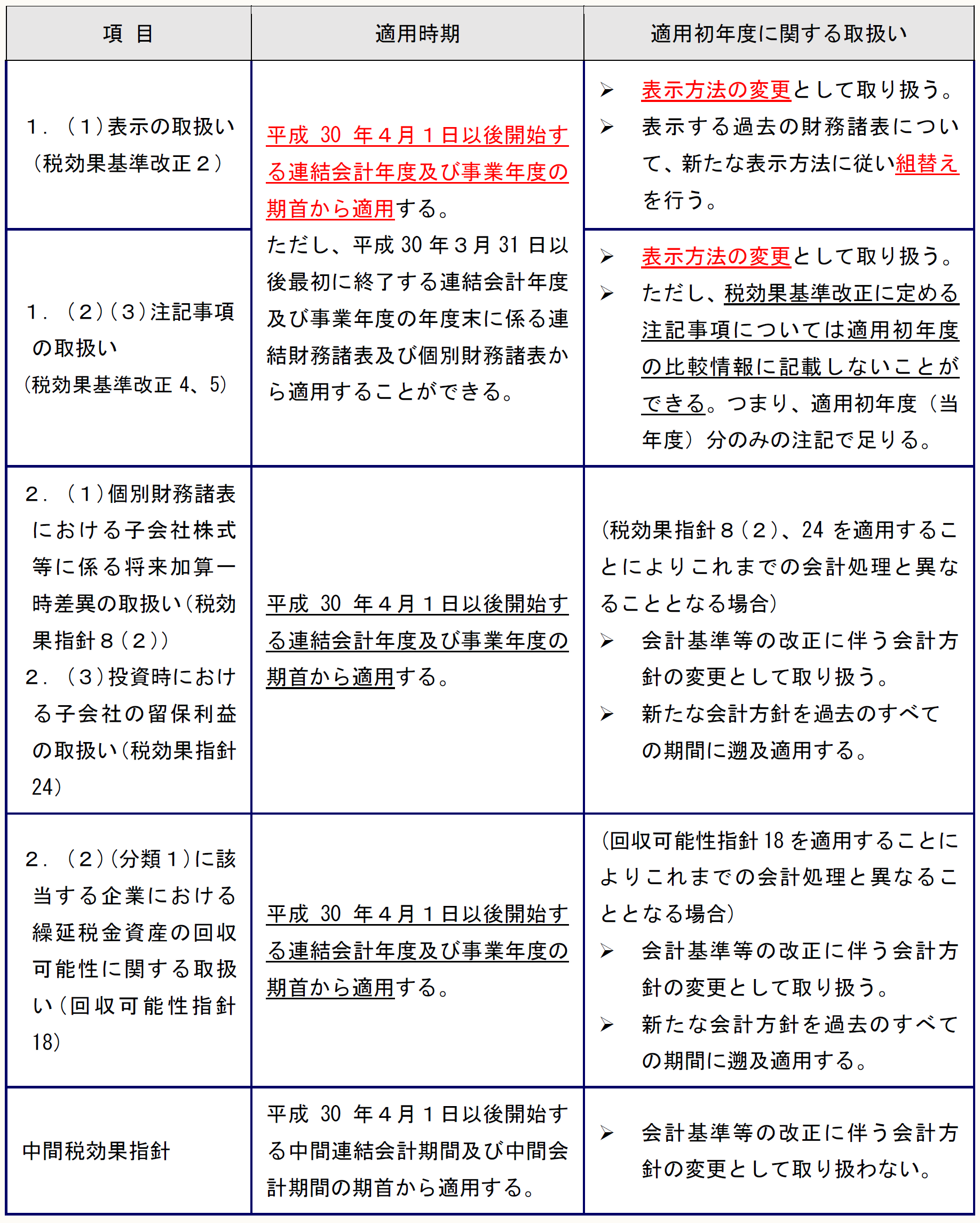 適用時期は以下のとおりである(税効果基準改正6、7、税効果指針65、回収可能性指針49、中間税効果指針22、23)。
