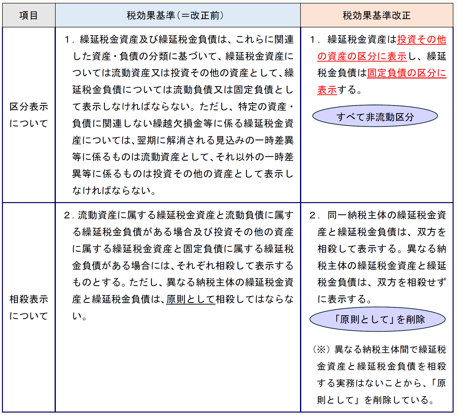 税効果基準改正では、税効果基準の「第三 繰延税金資産及び繰延税金負債等の表示方法」1及び2が、以下のとおり改正されている(税効果基準改正2)。
