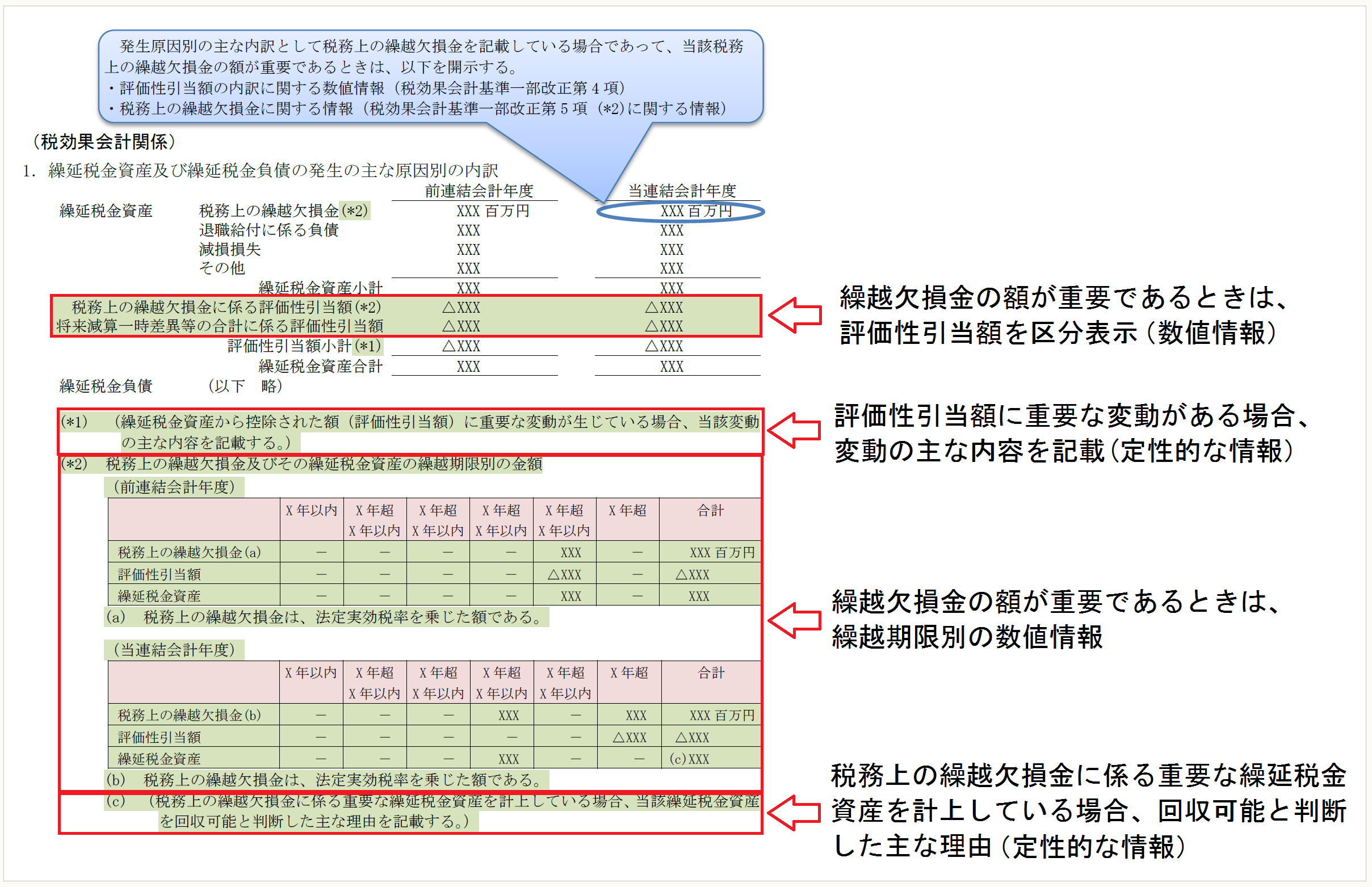 繰越欠損金の額が重要であるときは、繰越期限別の数値情報、重要な繰延税金資産を計上している場合の回収可能と判断した主な理由(定性的な情報)を注記する。