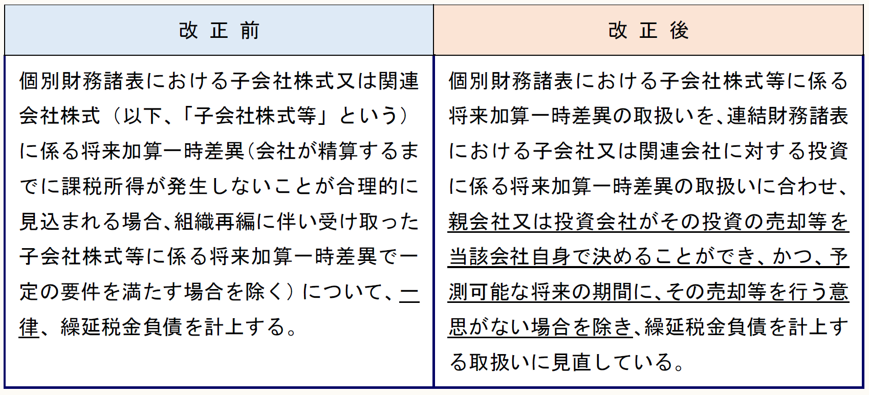 改正前では、個別財務諸表における子会社株式又は関連会社株式(以下、「子会社株式等」という)に係る将来加算一時差異(会社が精算するまでに課税所得が発生しないことが合理的に見込まれる場合、組織再編に伴い受け取った子会社株式等に係る将来加算一時差異で一定の要件を満たす場合を除く)について、一律、繰延税金負債を計上することになっていたが、個別財務諸表における子会社株式等に係る将来加算一時差異の取扱いを、連結財務諸表における子会社又は関連会社に対する投資に係る将来加算一時差異の取扱いに合わせ、親会社又は投資会社がその投資の売却等を当該会社自身で決めることができ、かつ、予測可能な将来の期間に、その売却等を行う意思がない場合を除き、繰延税金負債を計上するという取扱いに見直している(税効果指針8(2))。