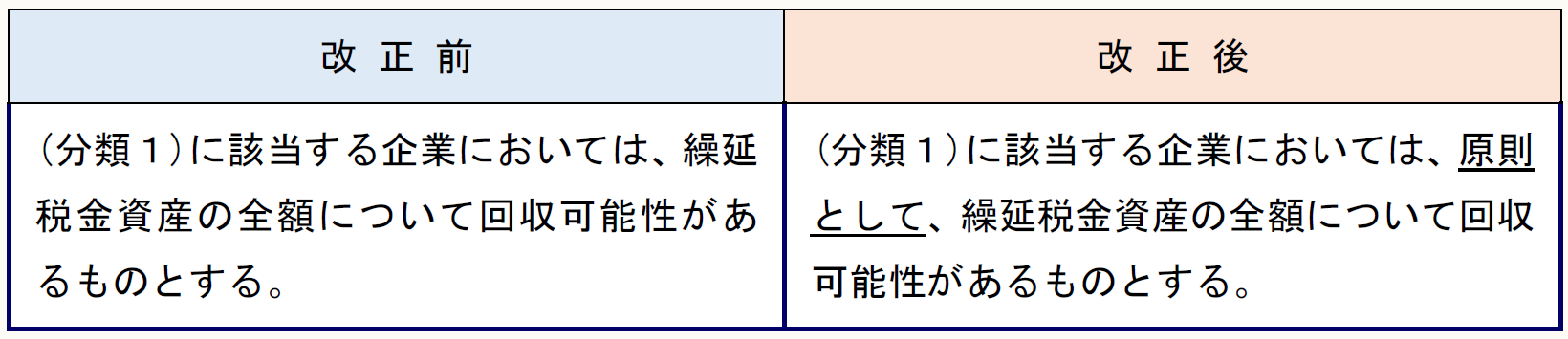 改正前は、(分類1)に該当する企業においては、繰延税金資産の全額について回収可能性があるものとなっていたが、完全支配関係にある国内の子会社株式の評価損(※)について、企業が当該子会社を精算するまで当該子会社株式を保有し続ける方針がある場合等、将来において税務上の損金に算入される可能性が低い場合に当該子会社株式の評価損に係る繰延税金資産の回収可能性はないと判断することが適切であると考えられるため、「原則として、」繰延税金資産の全額について回収可能性があるというように改正されている(回収可能性指針18、67-4)。