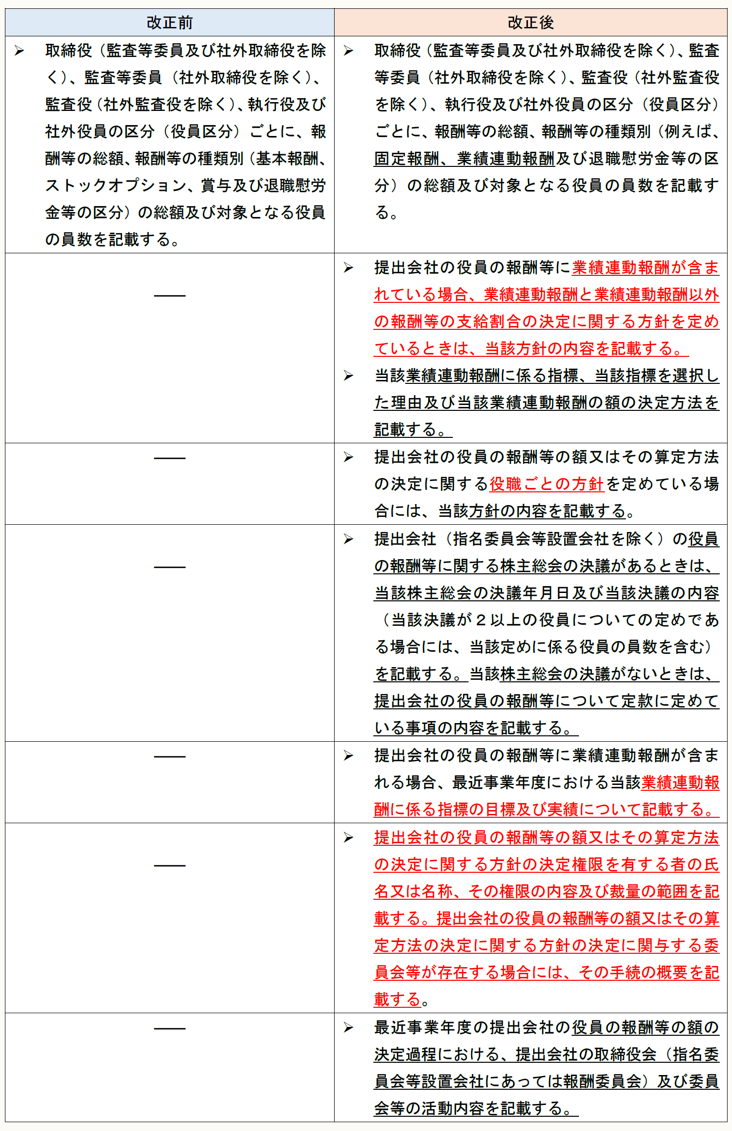 有価証券報告書の第一部【企業情報】第4【提出会社の状況】の「コーポレート・ガバナンスの状況等」の「役員の報酬等」の記載が以下のように改正されている(企業内容等の開示に関する内閣府令 第二号様式 記載上の注意(57)、第三号様式 記載上の注意(38)等)。
