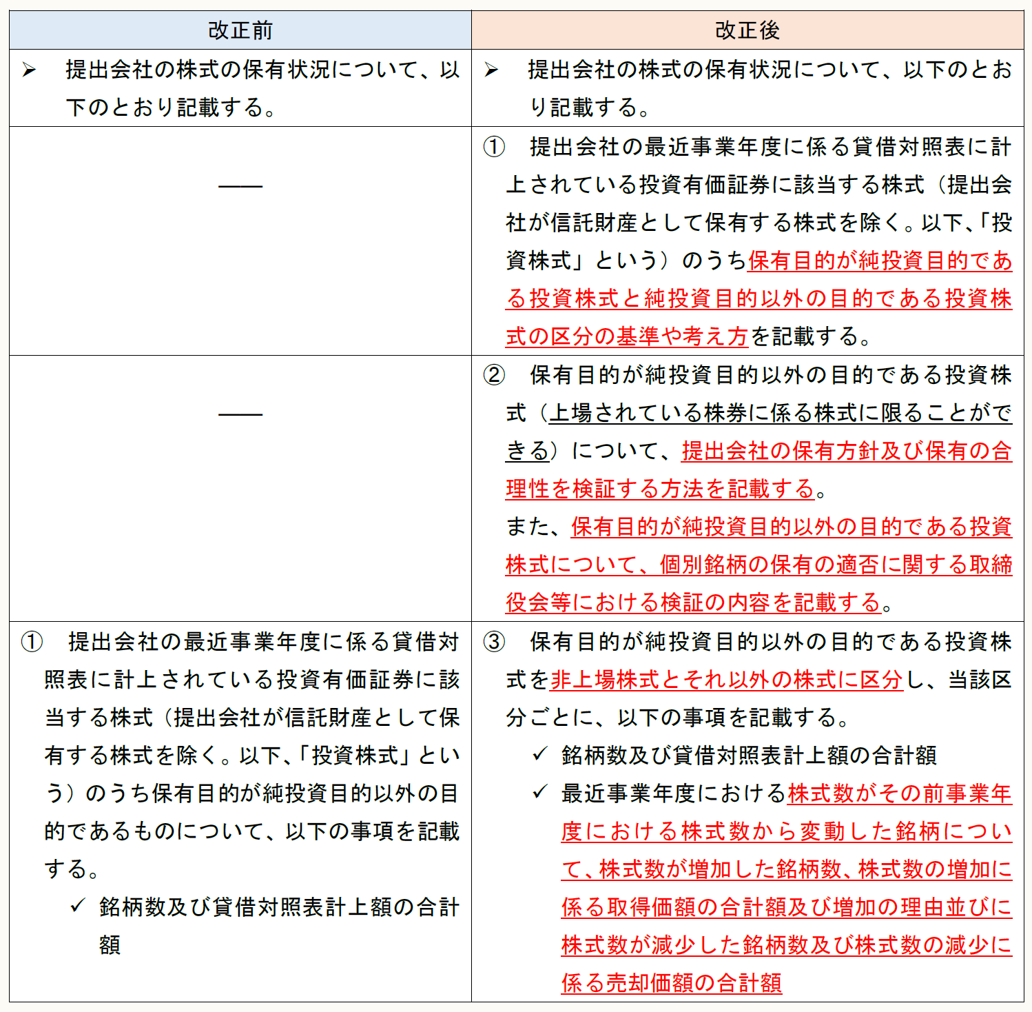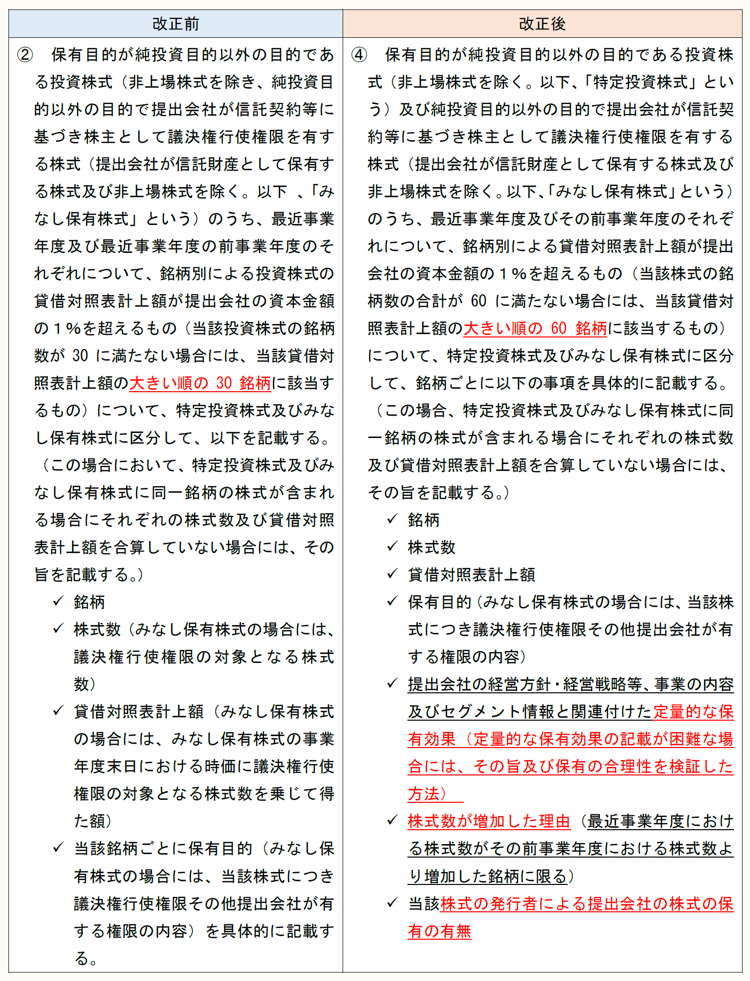 有価証券報告書の第一部【企業情報】第4【提出会社の状況】の「コーポレート・ガバナンスの状況等」の「株式の保有状況」の記載が以下のように改正されている(企業内容等の開示に関する内閣府令 第二号様式 記載上の注意(58)、第三号様式 記載上の注意(39)等)。