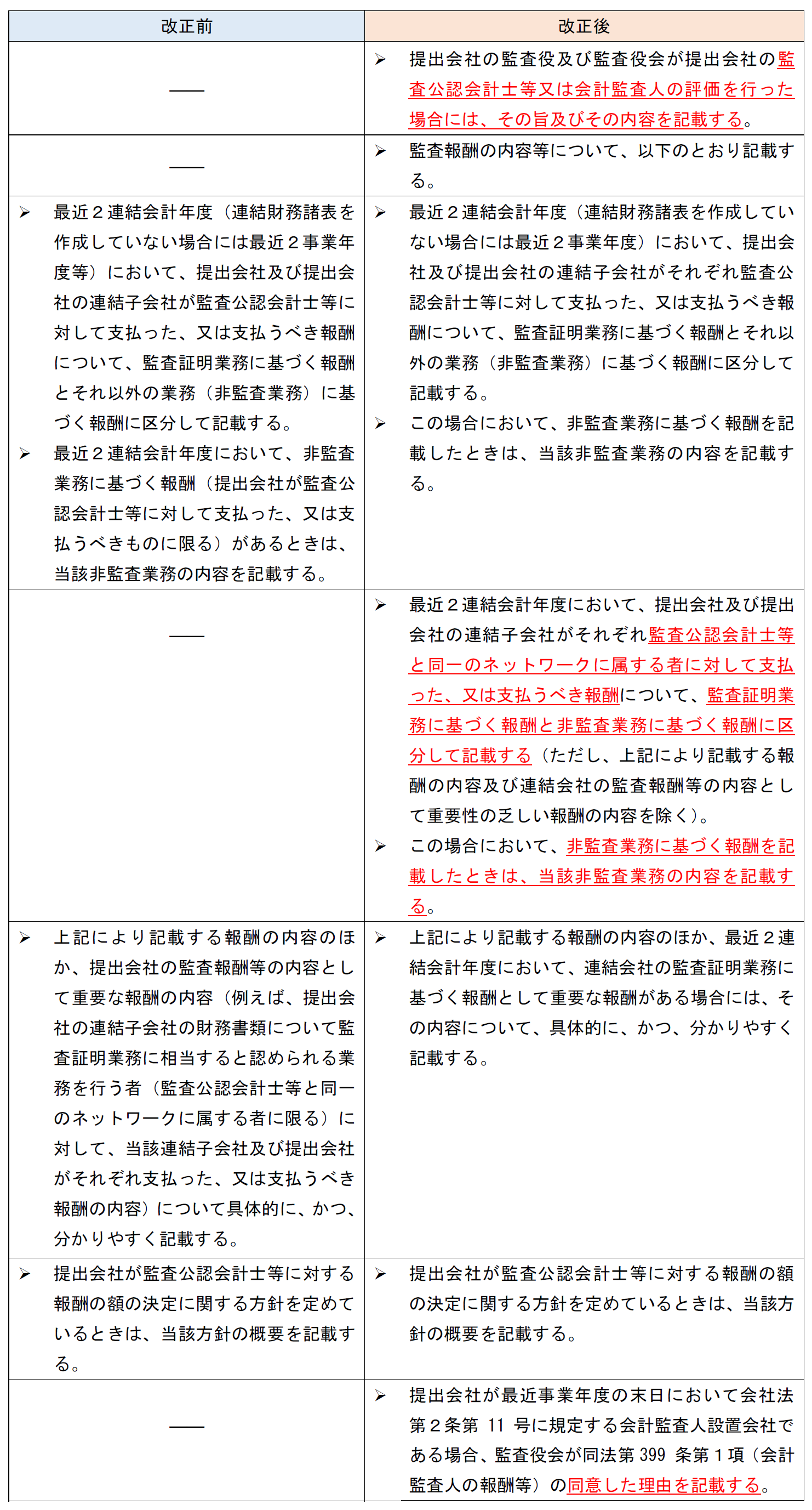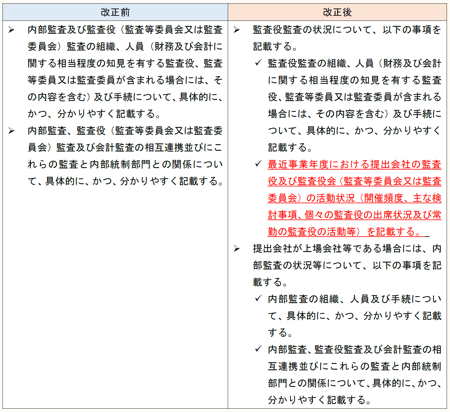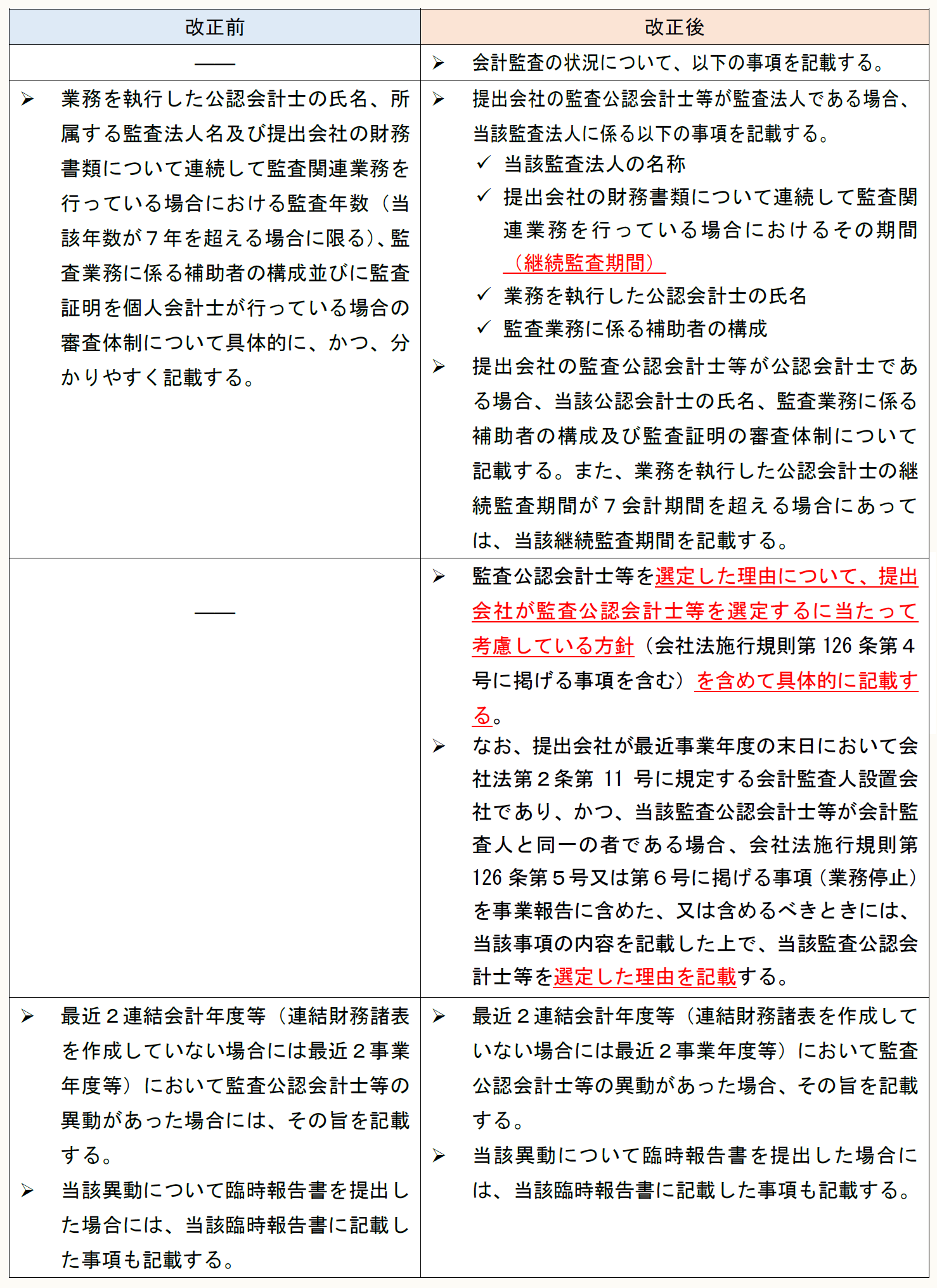有価証券報告書の第一部【企業情報】第4【提出会社の状況】の「コーポレート・ガバナンスの状況等」の「監査の状況」の記載が以下のように改正されている(企業内容等の開示に関する内閣府令 第二号様式 記載上の注意(56)、第三号様式 記載上の注意(37)等)。