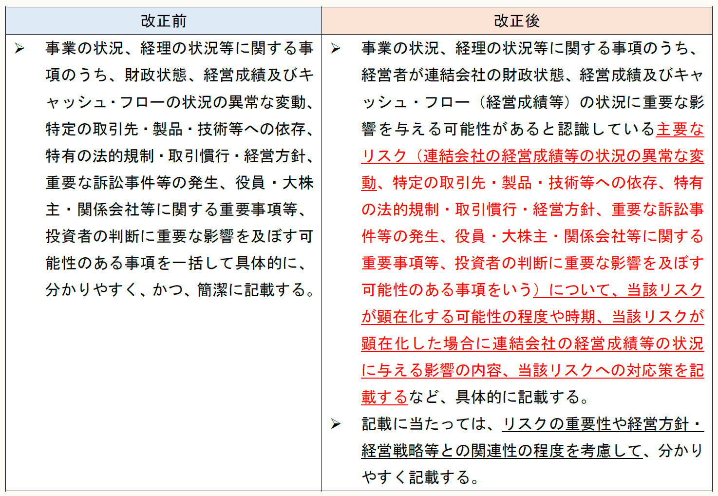 有価証券報告書の第一部【企業情報】第2【事業の状況】の「事業等のリスク」の記載が以下のように改正されている(企業内容等の開示に関する内閣府令 第二号様式 記載上の注意(31)、第三号様式 記載上の注意(11)等)。
