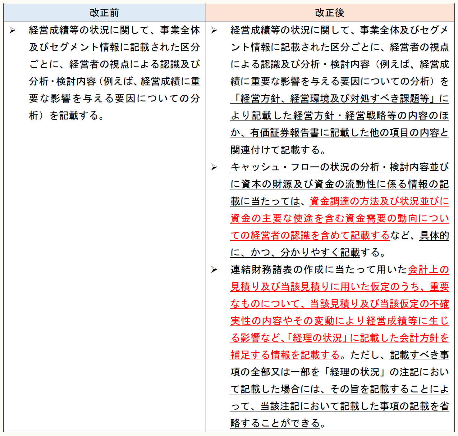 有価証券報告書の第一部【企業情報】第2【事業の状況】の「経営者による財政状態、経営成績及びキャッシュ・フローの状況の分析」の記載が以下のように改正されている(企業内容等の開示に関する内閣府令 第二号様式 記載上の注意(32)、第三号様式 記載上の注意(12)等)。