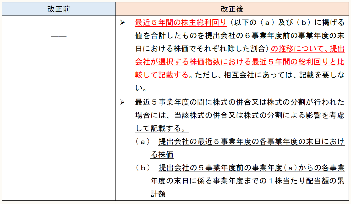 最近5年間の株主総利回りの推移について、提出会社が選択する株価指数における最近5年間の総利回りと比較した記載