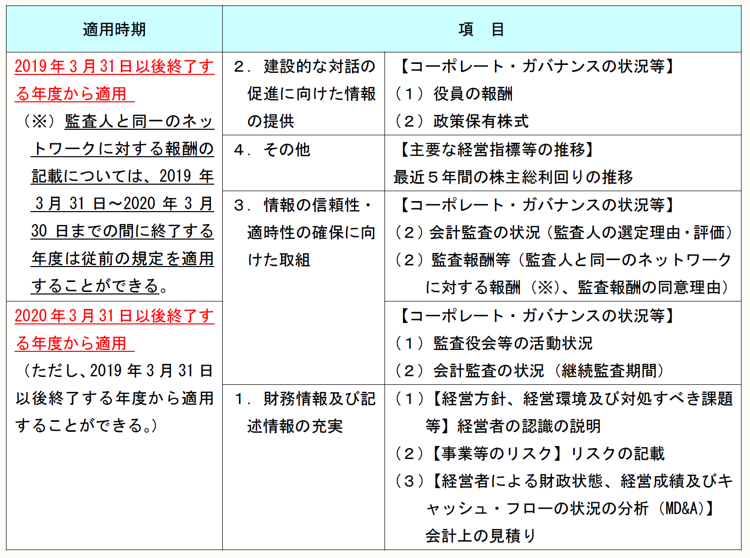 財務情報及び記載情報の充実のため、有価証券報告書において以下の記載が求められる。