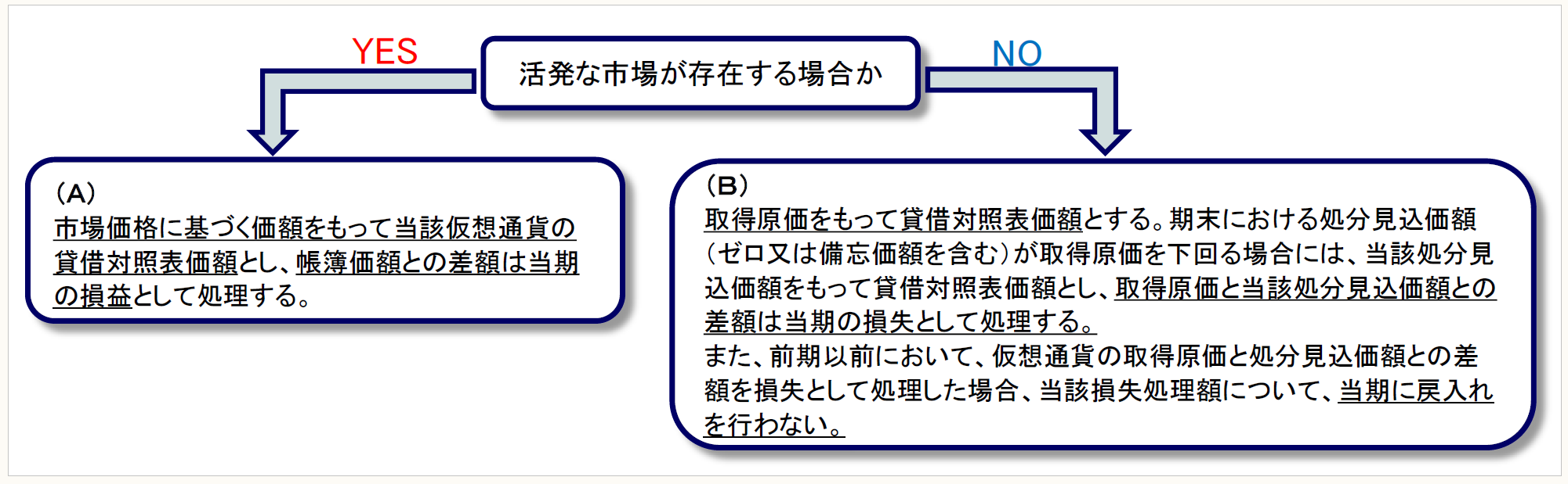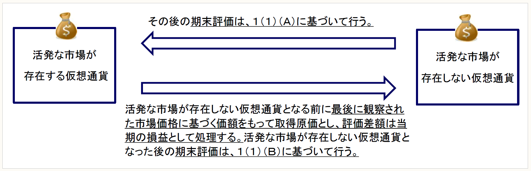 活発な市場が存在する仮想通貨が、その後、活発な市場が存在しない仮想通貨となった場合、活発な市場が存在しない仮想通貨となる前に最後に観察された市場価格に基づく価額をもって取得原価とし、評価差額は当期の損益として処理する。活発な市場が存在しない仮想通貨となった後の期末評価は、上記1(1)(B)に基づいて行う。