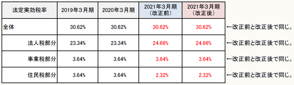 地方法人課税の偏在是正のための改正であるため、法定実効税率に変更はない(注)。