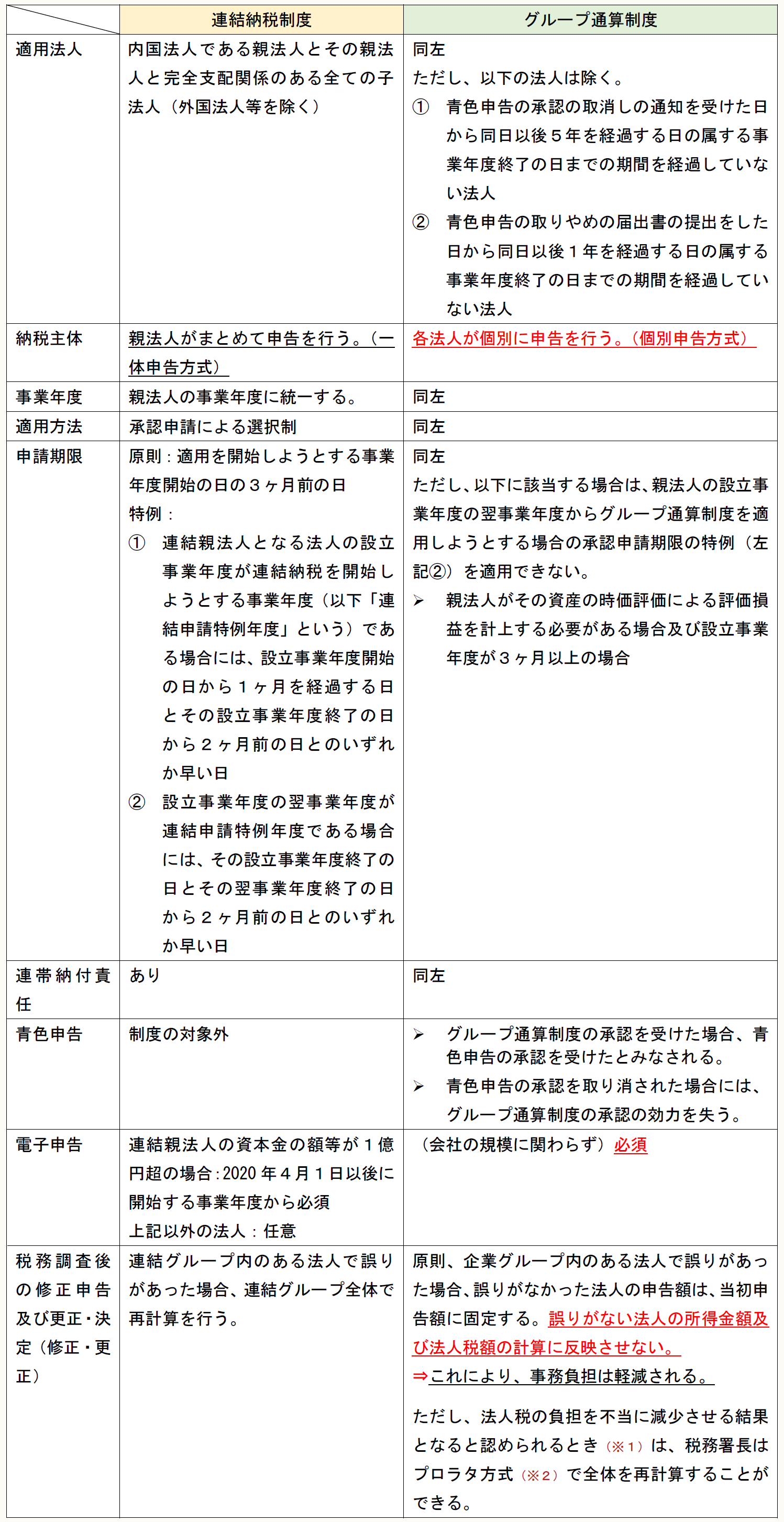 連結納税制度とグループ通算制度の適用関係等の主な相違点は、以下のとおりである。