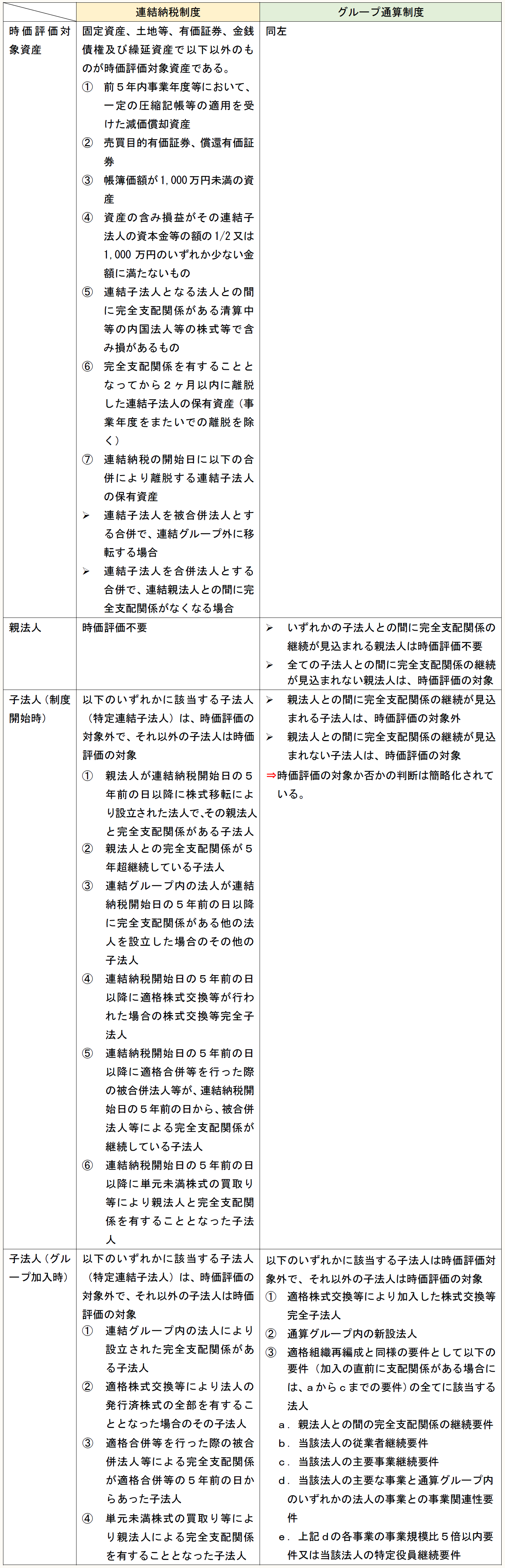 グループ通算制度においても、時価評価は行われる。連結納税制度とグループ通算制度における相違点は、以下のとおりである。