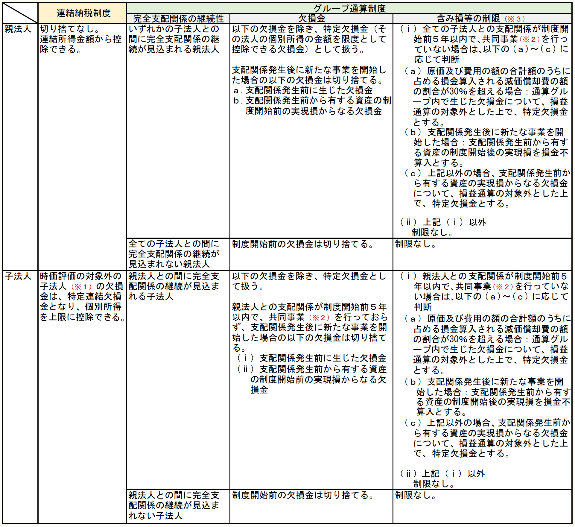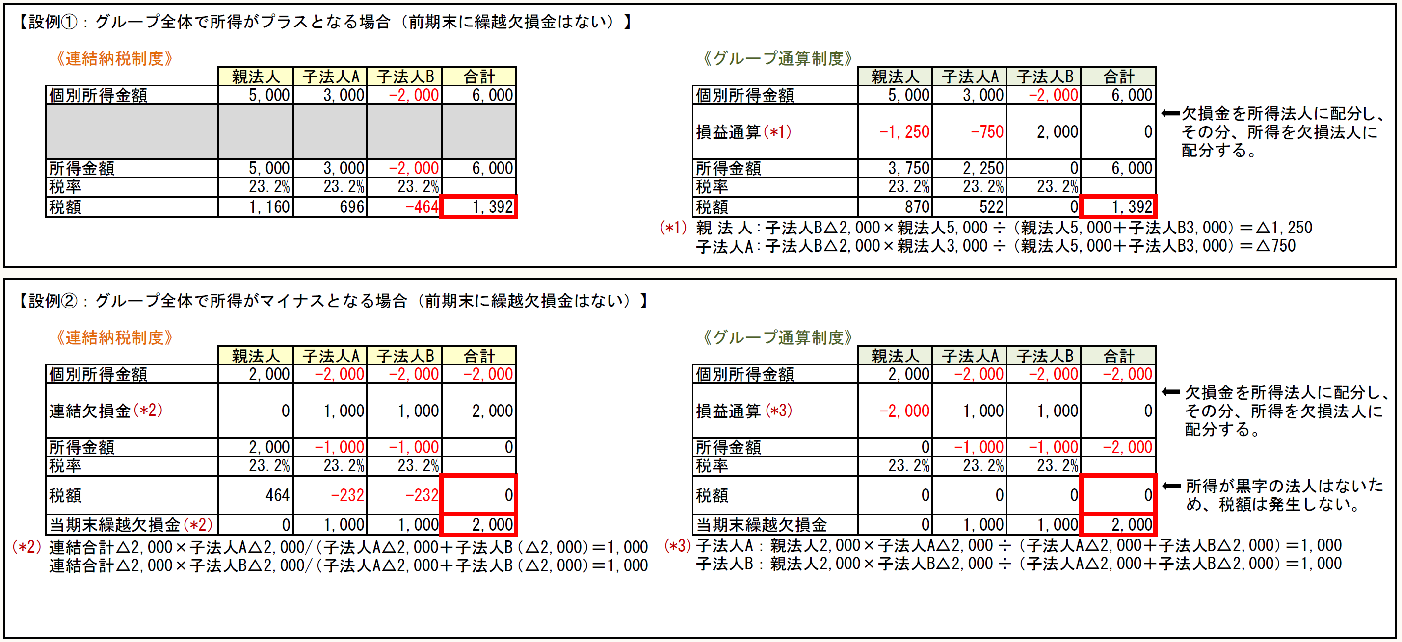 (※2) プロラタ方式とは、以下の計算のことをいう。欠損法人の欠損金額の合計額(所得法人の所得の金額の合計額を限度)を所得法人の所得の金額の比で配分し、所得法人において損金算入する。そして、この損金算入された金額の合計額を欠損法人の欠損金額の比で配分し、欠損法人において益金算入する。