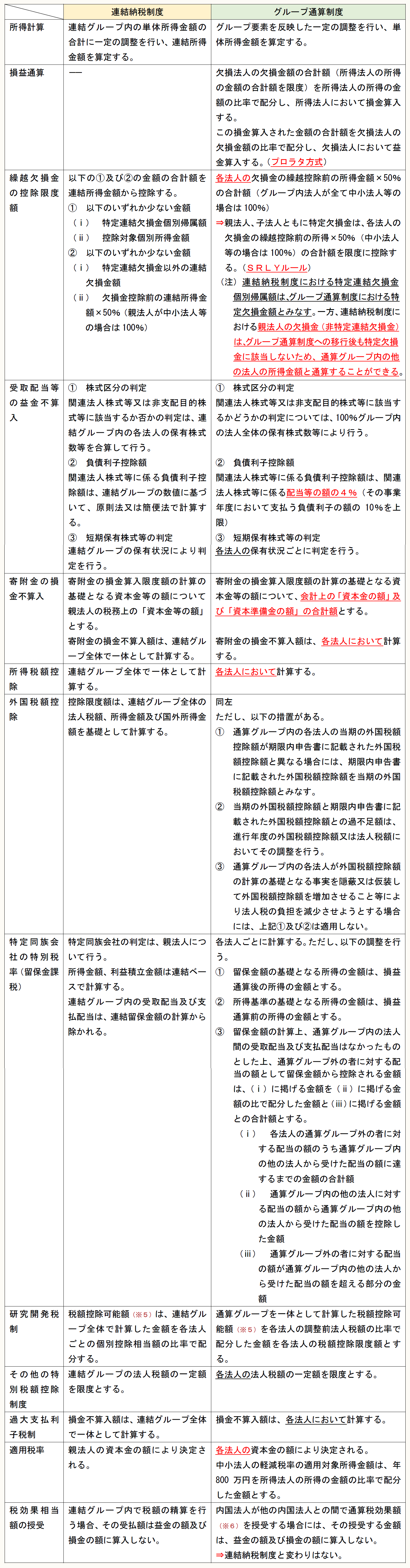 所得金額及び法人税額の計算の連結納税制度とグループ通算制度における相違点は、以下のとおりである。