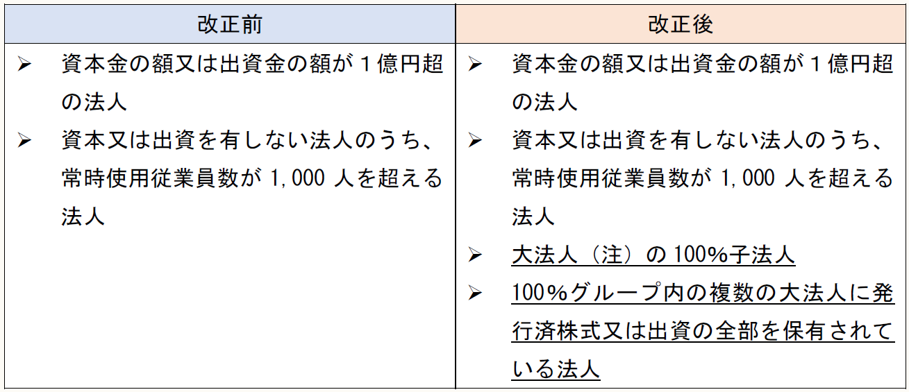 (注) 「大法人」とは、資本金の額又は出資金の額が5億円以上である法人、相互会社もしくは外国相互会社(常時使用従業員数が1,000人超のものに限る)又は受託法人をいう。