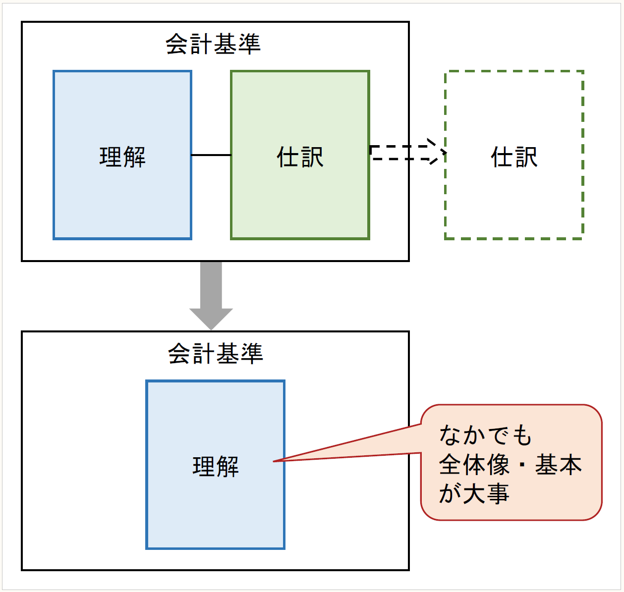 そして、「仕訳」です。会計基準は公表される会社の決算や財務諸表を通して活かされるものですので、多くは会計処理を伴います。仕訳は会計処理の答えになる型なので、早く答えを探したいときは、つい会計基準の言わんとすることをほったらかしにして、仕訳を求めにいってしまいます。実はこのタイプの方はとても多いのです。