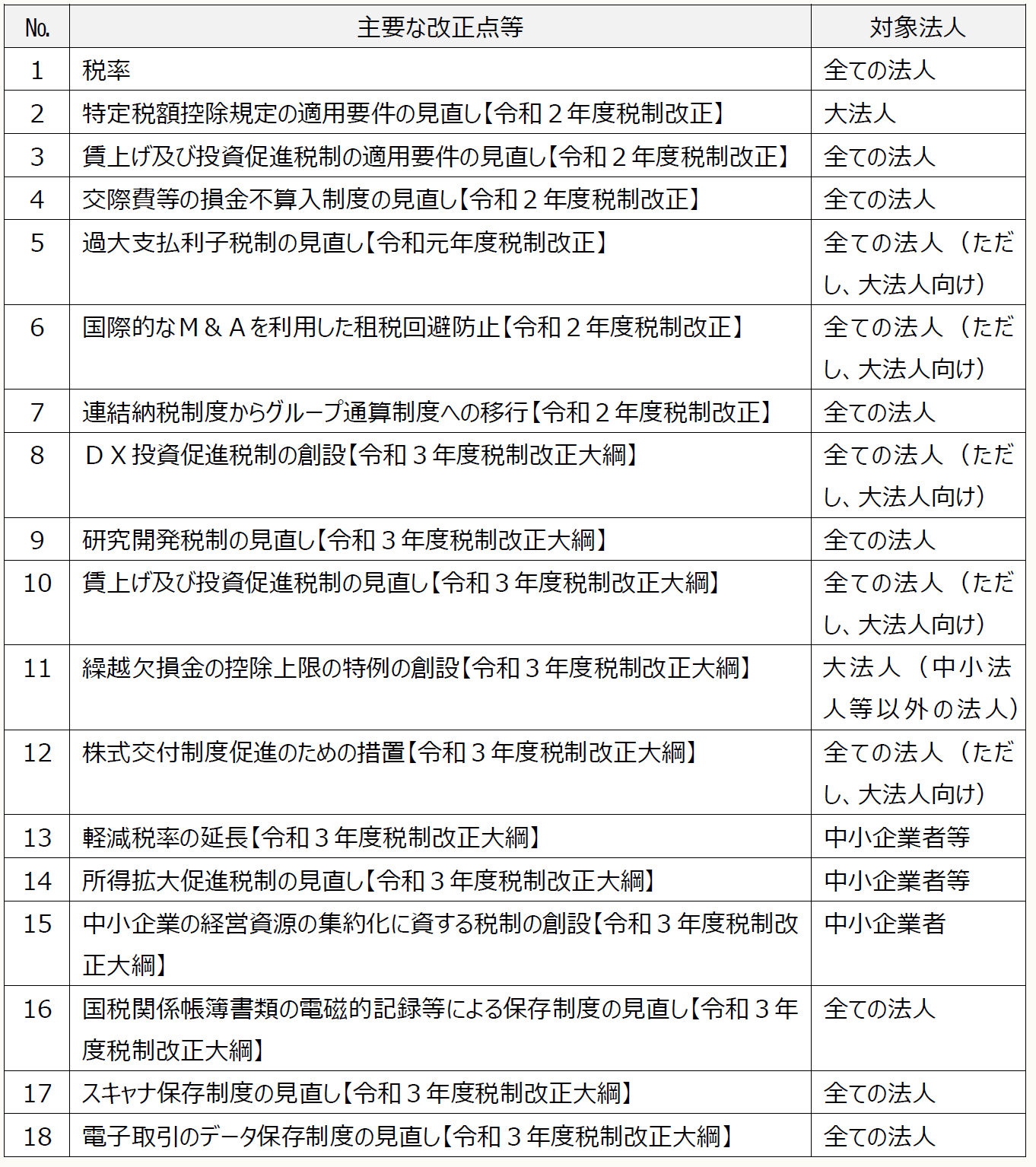令和元年度及び令和2年度税制改正並びに令和3年度税制改正大綱(以下、「税制改正大綱」という)のうち、主要な改正点等としては、以下が挙げられる。