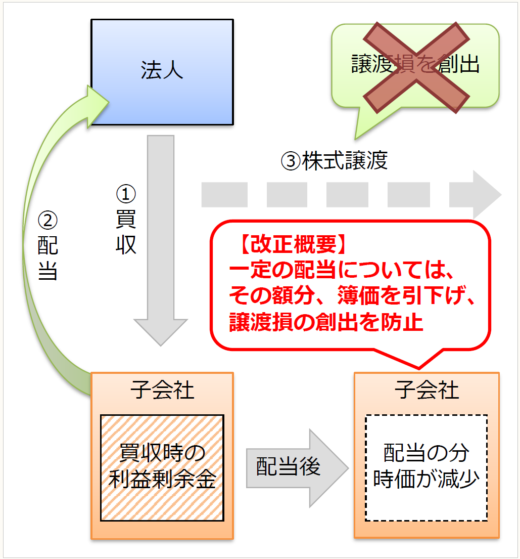 そのため、改正前は、子会社の配当後に子会社株式を第三者に譲渡することによる過度な節税対策が行われていた。そこで、子会社からの配当と子会社株式の譲渡を組み合わせた租税回避への対応のための見直しが行われた。
