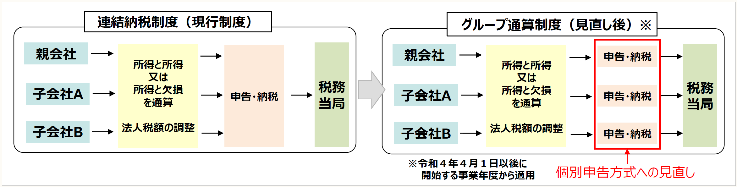連結納税制度は、企業グループの各法人を納税主体とするのではなく、グループ全体で1つの納税主体とするものである。しかし、連結納税制度は、企業グループ内の損益を通算できるメリットがある一方で、税額計算が煩雑であったり、どこか1つの法人で誤りがあった場合、グループ全体で税金の再計算をしないといけないなどのデメリットもある。そのため、より使いやすくするために、企業グループ内の損益通算は残しつつ、各社ごとに申告及び納税する「グループ通算制度」へ移行する改正が行われている。