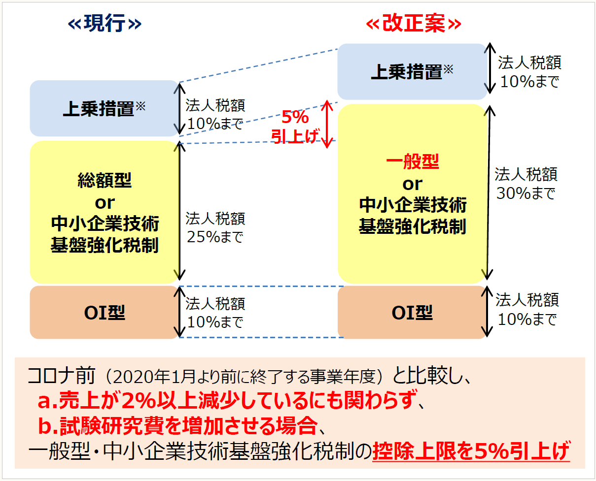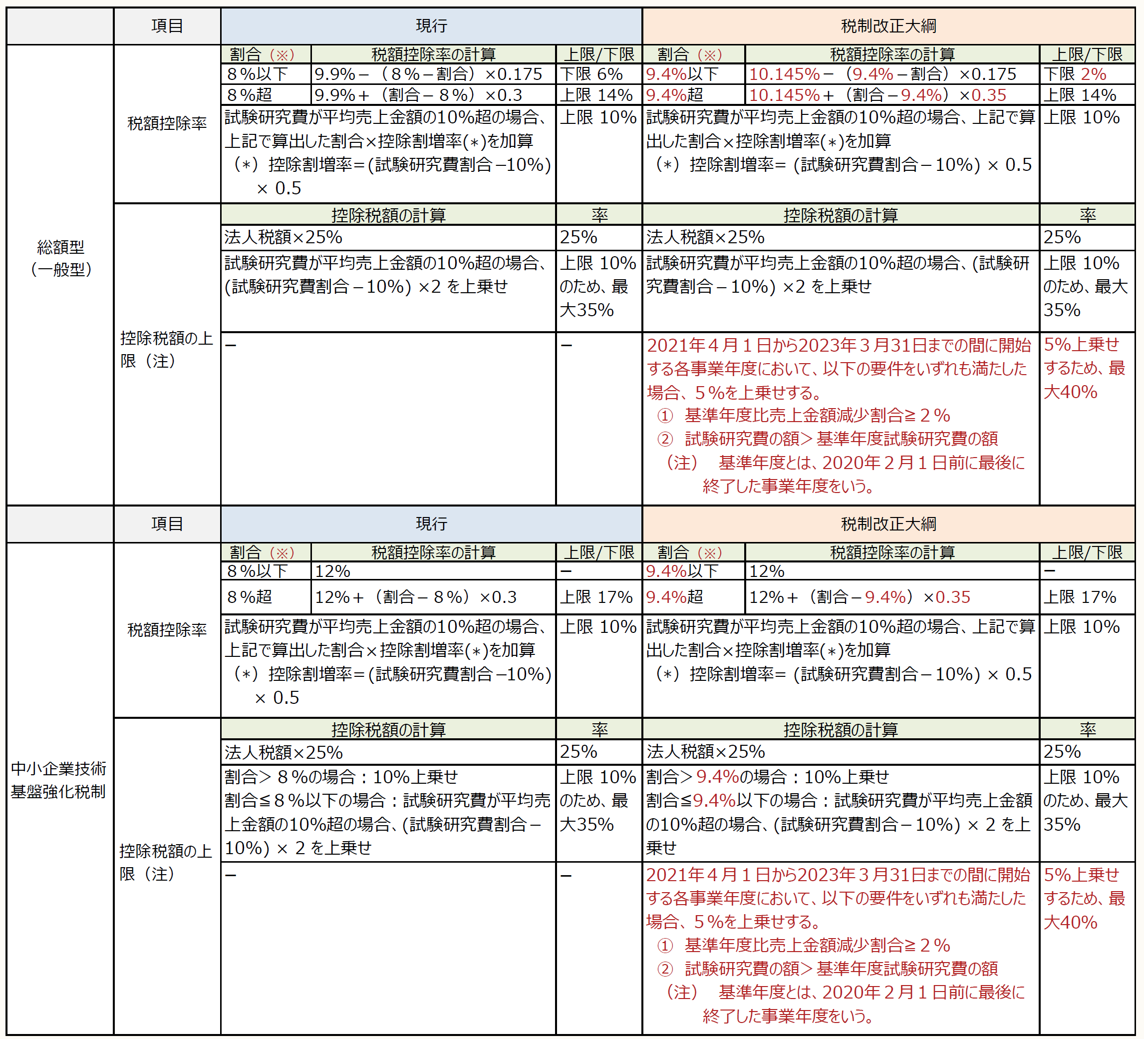 試験研究費の総額に係る税額控除制度(総額型・一般型)及び中小企業技術基盤強化税制の税額控除率の見直しが行われ、また、適用期限も2年延長(2023年3月31日まで)されている。また、控除税額の上限の見直しも行われ、2021年4月1日から2023年3月31日までの間に開始する事業年度において適用される。