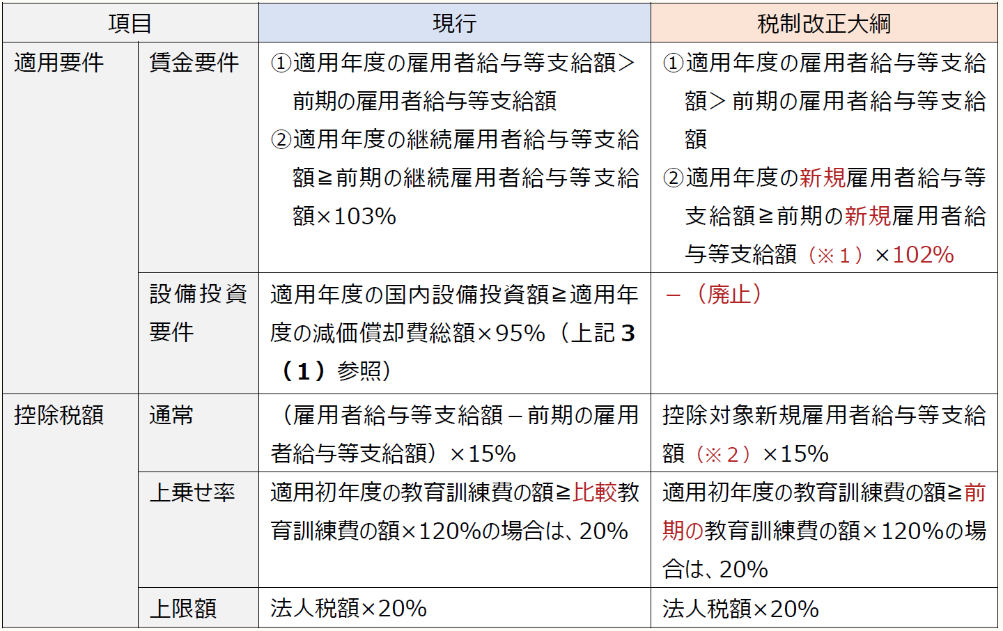 (※2) 「控除対象新規雇用者給与等支給額」とは、国内の事業所において新たに雇用した者(支配関係がある法人から異動した者及び海外から異動した者を除く)に対してその雇用した日から1年以内に支給する給与等の支給額をいう。また、雇用者給与等支給額から前期の雇用者給与等支給額を控除した金額を上限とする。「新規雇用者給与等支給額」と「控除対象新規雇用者給与等支給額」は、対象範囲が異なるため、留意が必要である。