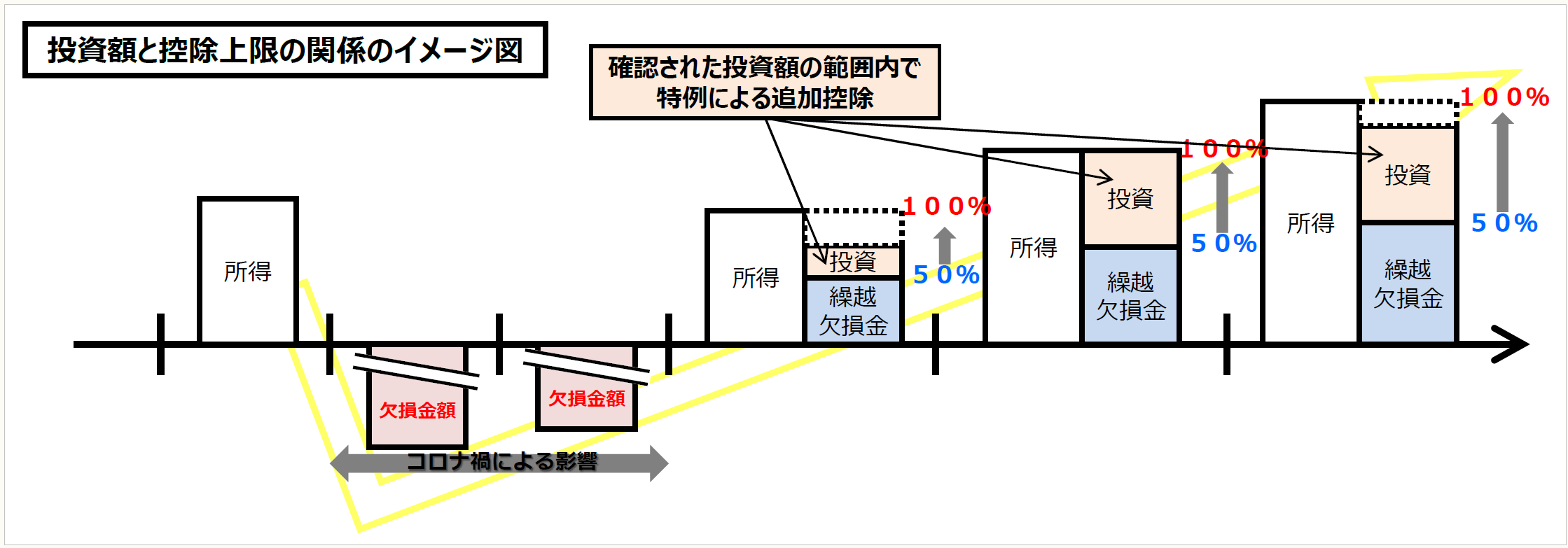 青色申告書を提出する法人で産業競争力強化法の改正法の施行の日から同日以後1年を経過する日までの間に産業競争力強化法の事業適応計画(仮称)の認定を受けていて、事業適応計画に従って事業適応(仮称)(※)を実施するものの、適用事業年度(下記(2)参照)において特例対象欠損金額(原則、2020年4月1日から2021年4月1日までの期間内の日を含む事業年度(最長2年間)に生じた青色欠損金額)がある場合には、最大で5年間、欠損金の繰越控除前の所得の金額(所得の金額の50%を超える部分については、累積投資残額(下記(3)参照)に達するまでの金額に限る)の範囲内で損金算入できる。累積投資残額の範囲内であれば、大法人であっても100%控除できる。