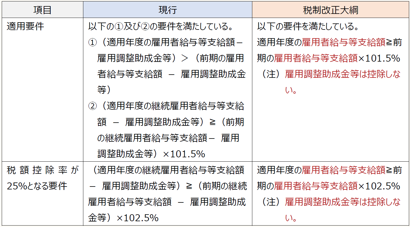 新規雇用者の給与及び教育訓練の増加に対する税制の見直しが行われている。